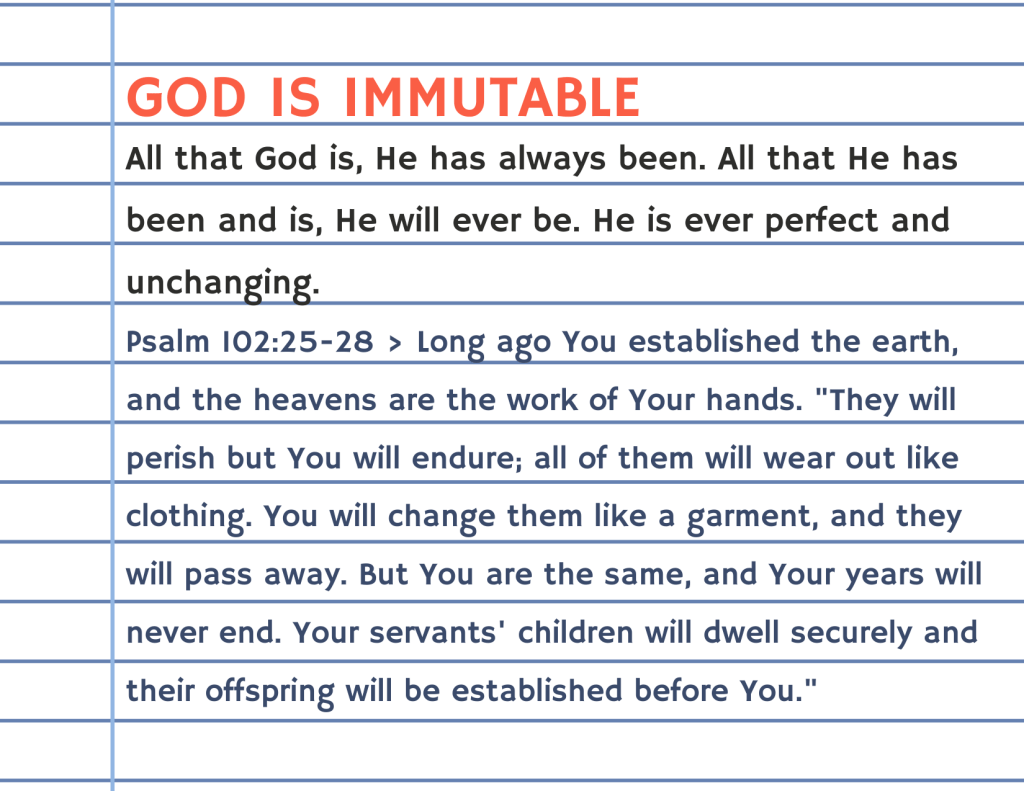 Let’s start with the original definition of the word immutable. Its root is mute – a verb that first meant “to change”. Immutable means “not having the ability to change.” The Psalmist writes that everything God created will change, decay, and wear out, but He will never change. When this earth is gone, He will still be good and loving, just as He is today and just as He was at the beginning of time. It’s a comfort to know that God’s goodness and His love for us will never decay and disappear. He will never become less of Who He is.