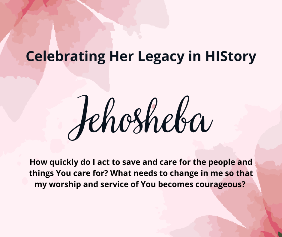 Jehosheba is mentioned only twice in Scriptures and her bold action is described in both passages. There are many characters in her story. Jehosheba’s father was King Jehoram, the king of Judah. He had many wives and one wife was Athaliah, a daughter of Ahab and Jezebel (consider the ultimate wicked step-mother). Jehosheba married a priest in Jerusalem named Jehoiada. Athaliah had a son, Ahaziah. When Jehoram died, Ahaziah became the king. During Ahaziah’s reign, God sent Jehu to destroy the evil household of Ahab and Jezebel and the prophets of Baal in Israel. Jehu eradicated the family in Israel and then moved toward Judah to execute their family there. He found Ahaziah, his brothers and those who served him and executed them all. When that happened, Athaliah decided she would rule Judah and she annihilated all the royal male heirs, Jehoram’s line, she could find. Jehosheba hid an infant heir, Joash, and his nurse in the temple. They lived hidden in the temple for six years. When he turned seven, Jehoiada, the priest and Jehosheba’s husband, sent for the commanders of the army, bodyguards, and couriers and introduced them to Joash. They revolted against Athaliah and made Joash king. Joash reigned forty years and did what was right in God’s sight.