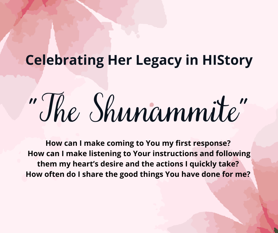 Her story: 2 Kings 4:8-37, 8:4-5When Elisha the prophet traveled through Shunem, this wealthy, godly, generous woman created a room where Elisha could stay when he was in the area. To repay her kindness, Elisha told her God would give her a son and He did. Later, her son died in the field and the Shunammite (as Elisha called her) placed him on Elisha’s bed. She immediately traveled to get Elisha. She did not stop to explain things to Gehazi, Elisha’s servant, when he came out to meet her. Elisha returned with her and raised her son from the dead. Elisha continued to use her room when he was in Shunem. One day, he warned her of a seven-year famine about to start. He told her to move away. She did as he instructed and moved her entire household to Philistia. When she returned at the end of seven years, she had no husband. So she went to the king to appeal for the return of her house and land. When she arrived, the king and Gehazi were discussing all the things Elisha had done. Gehazi told the king about the Shunammite woman and her son. Gehazi recognized her in the room and introduced her to the king. The king asked her about what had happened and she shared. When she was done, the king ordered that her house, land and all the income from her fields from the day she had left to the present were to be restored to her.