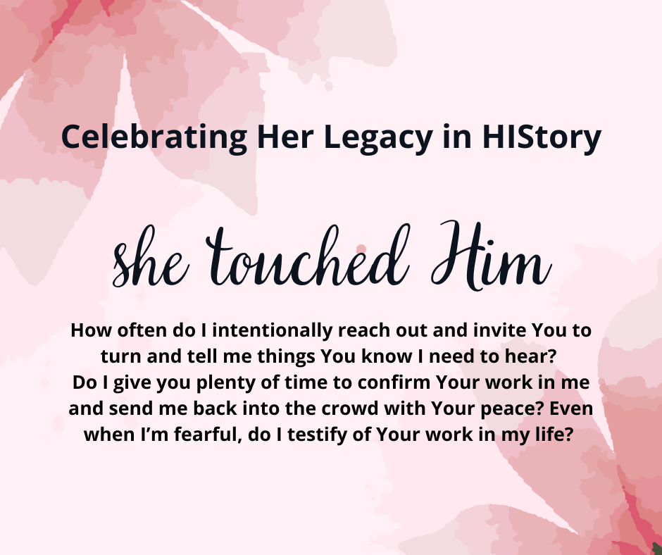 Our response to Him: How often do I intentionally reach out and invite You to turn and tell me things You know I need to hear? Do I give you plenty of time to confirm Your work in me and send me back into the crowd with Your peace? Even when I’m fearful, do I testify of Your work in my life?